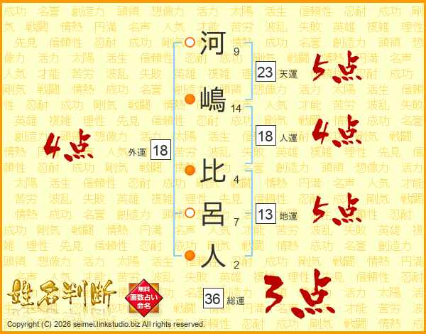 河(9画)嶋(14画) 比(4画)呂(7画)人(2画)