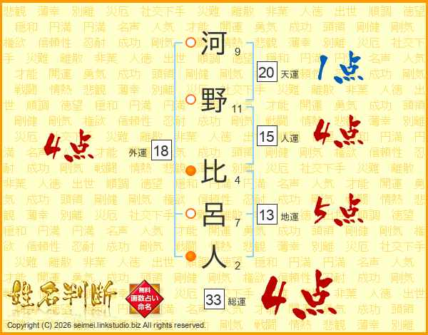 河(9画)野(11画) 比(4画)呂(7画)人(2画)