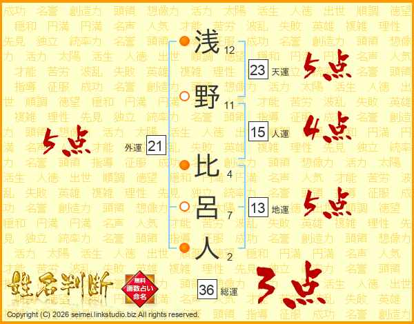 浅(12画)野(11画) 比(4画)呂(7画)人(2画)