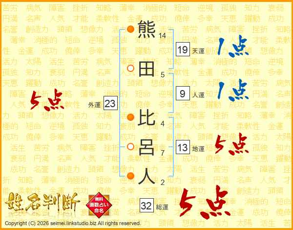 熊田比呂人さんの総運は32画の5点!