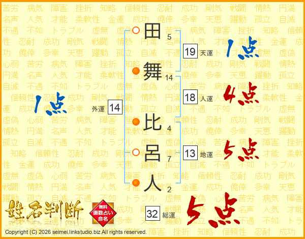 田舞比呂人さんの総運は32画の5点!