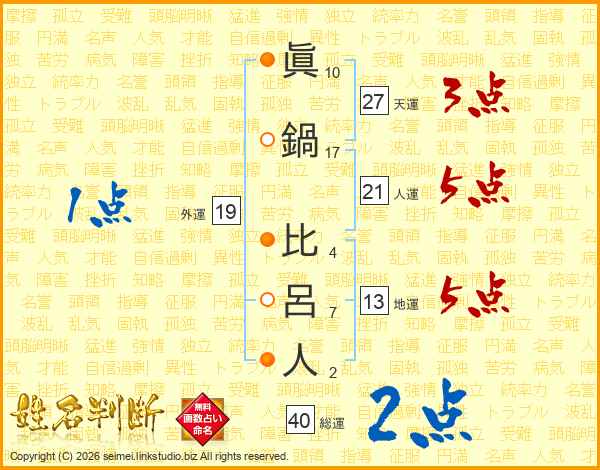 生活面を象徴する運勢です。外部から受ける影響力を表し、結婚運、家庭運や職場、環境への順応性を表します。総運から人運を引いた画数。姓や名が1文字の場合を除く。