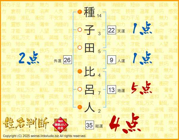 種(14画)子(3画)田(5画) 比(4画)呂(7画)人(2画)