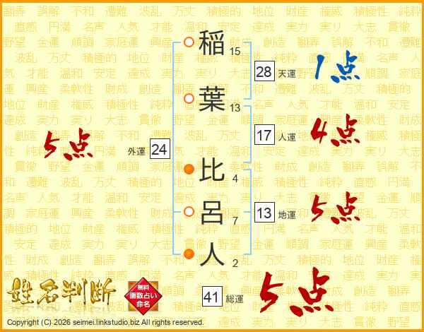 稲(15画)葉(13画) 比(4画)呂(7画)人(2画)