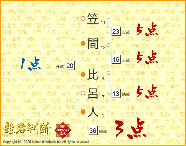 笠間比呂人さんの天運は23画の5点!