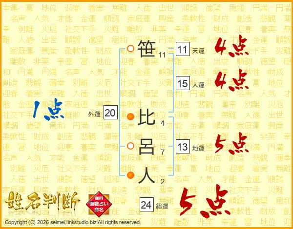 あなたの人生を表す1番重要な運勢です。生涯を通じて影響する総合運となり、主に50歳以降の晩年期に影響を及ぼします。苗字と名前の合計画数。
