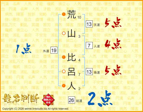 荒(10画)山(3画) 比(4画)呂(7画)人(2画)