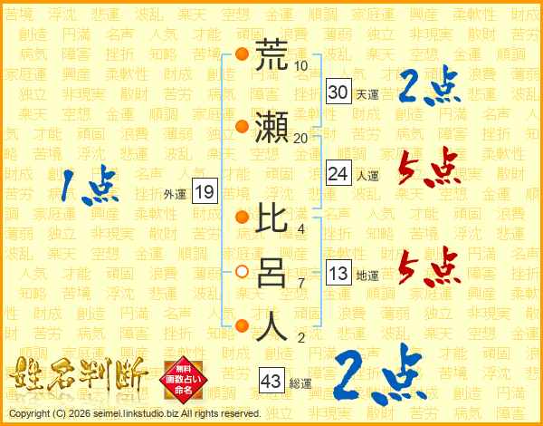 荒(10画)瀬(20画) 比(4画)呂(7画)人(2画)