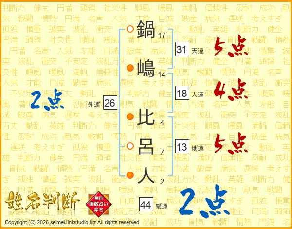 鍋(17画)嶋(14画) 比(4画)呂(7画)人(2画)