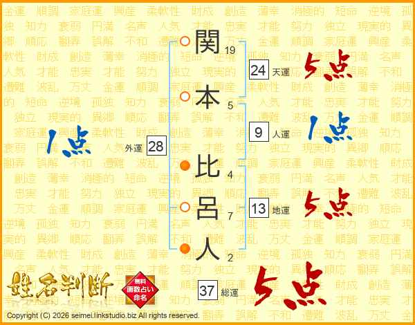 関(19画)本(5画) 比(4画)呂(7画)人(2画)