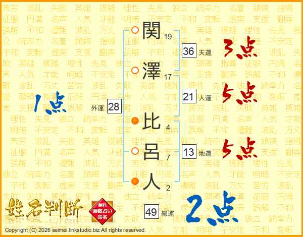 関澤比呂人さんの総運は49画の2点!