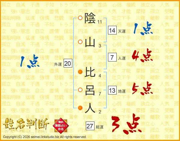 陰(11画)山(3画) 比(4画)呂(7画)人(2画)