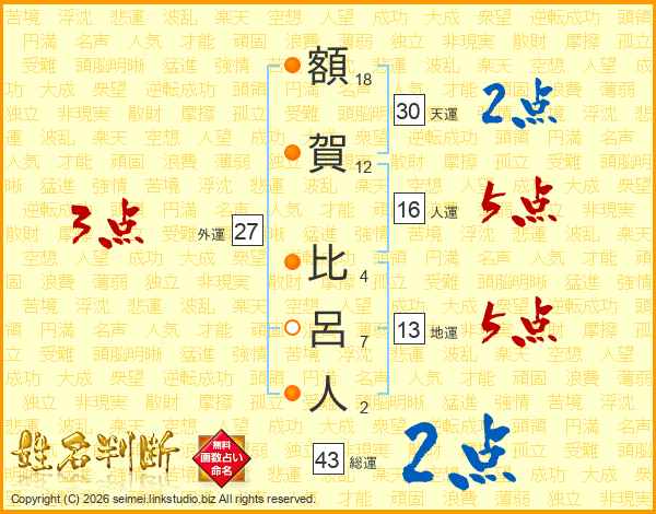 額(18画)賀(12画) 比(4画)呂(7画)人(2画)