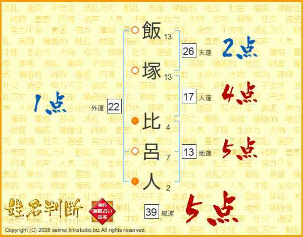飯(13画)塚(13画) 比(4画)呂(7画)人(2画)
