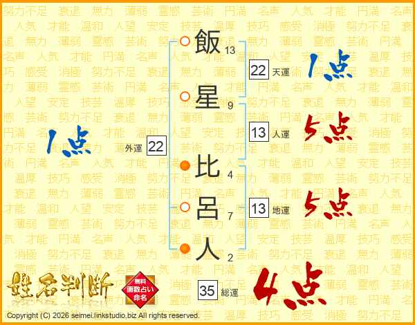 飯星比呂人さんの地運は13画の5点!