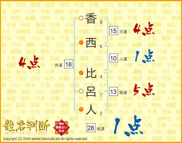 香(9画)西(6画) 比(4画)呂(7画)人(2画)