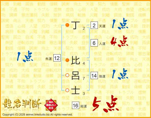 丁比呂士さんの総運は16画の5点!