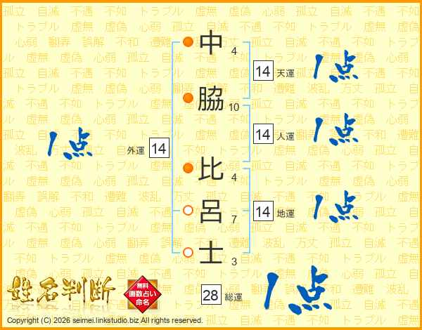 中(4画)脇(10画) 比(4画)呂(7画)士(3画)