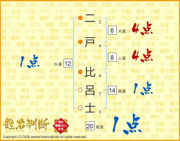 生活面を象徴する運勢です。外部から受ける影響力を表し、結婚運、家庭運や職場、環境への順応性を表します。総運から人運を引いた画数。姓や名が1文字の場合を除く。
