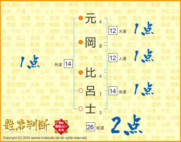 元(4画)岡(8画) 比(4画)呂(7画)士(3画)