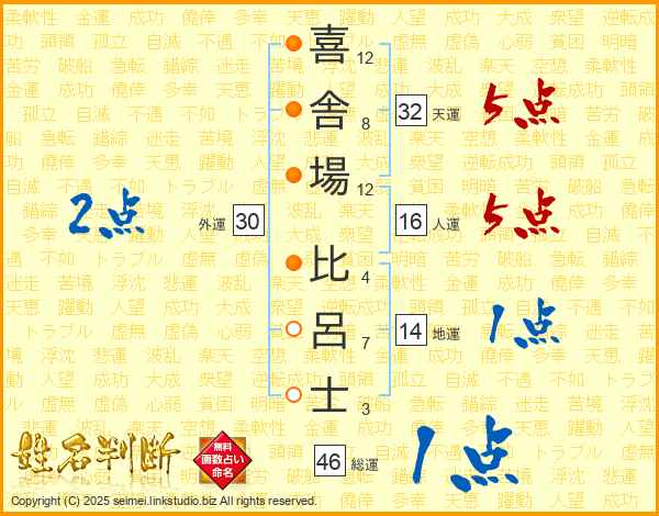 喜(12画)舎(8画)場(12画) 比(4画)呂(7画)士(3画)