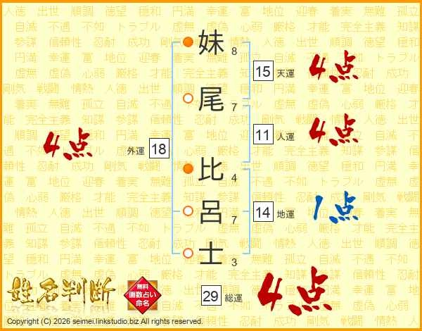 妹(8画)尾(7画) 比(4画)呂(7画)士(3画)