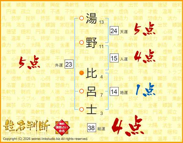 湯野比呂士さんの総運は38画の4点!