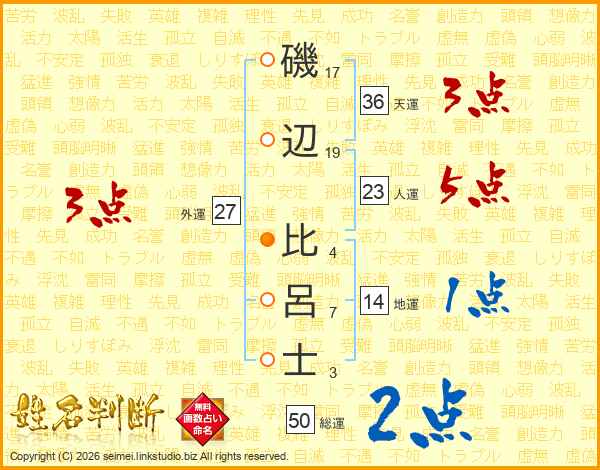 磯(17画)辺(19画) 比(4画)呂(7画)士(3画)