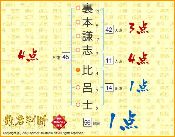 裏本謙志比呂士さんの総運は56画の1点!