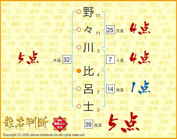生活面を象徴する運勢です。外部から受ける影響力を表し、結婚運、家庭運や職場、環境への順応性を表します。総運から人運を引いた画数。姓や名が1文字の場合を除く。
