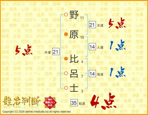 生活面を象徴する運勢です。外部から受ける影響力を表し、結婚運、家庭運や職場、環境への順応性を表します。総運から人運を引いた画数。姓や名が1文字の場合を除く。