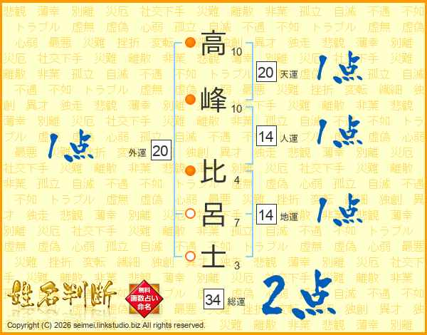 高峰比呂士さんの総運は34画の2点!