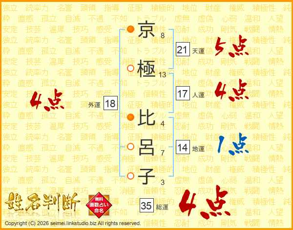 京(8画)極(13画) 比(4画)呂(7画)子(3画)