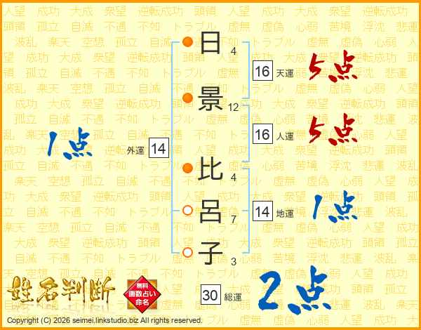 日(4画)景(12画) 比(4画)呂(7画)子(3画)