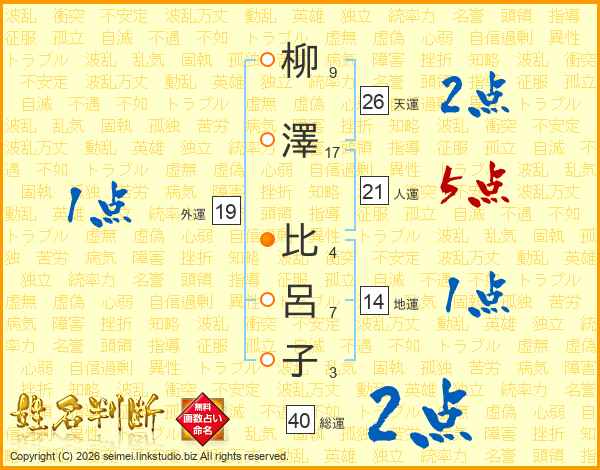 柳(9画)澤(17画) 比(4画)呂(7画)子(3画)