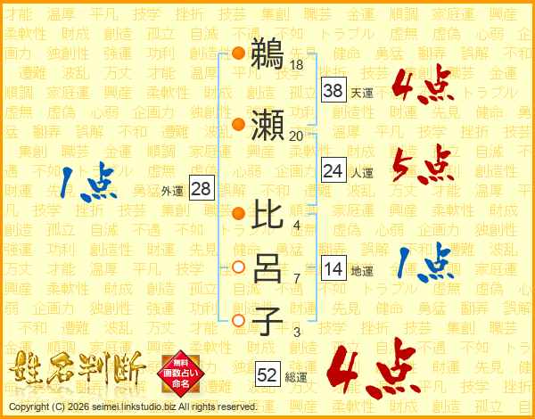 鵜(18画)瀬(20画) 比(4画)呂(7画)子(3画)