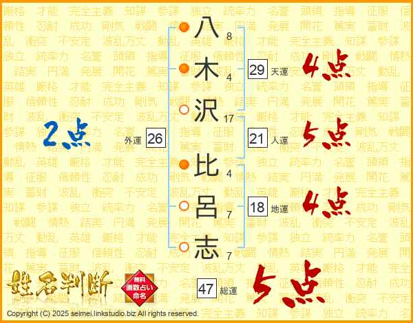 八木沢比呂志さんの総運は47画の5点!