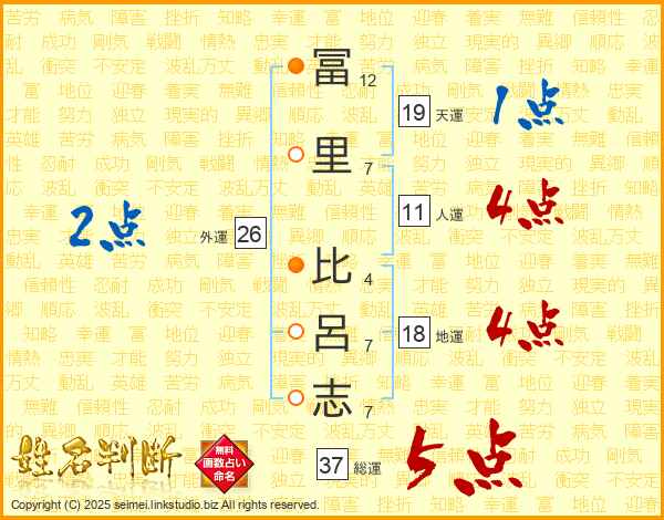 冨(12画)里(7画) 比(4画)呂(7画)志(7画)