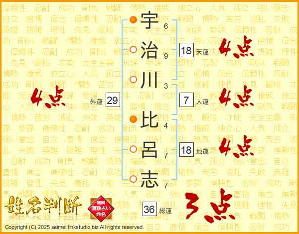 宇(6画)治(9画)川(3画) 比(4画)呂(7画)志(7画)