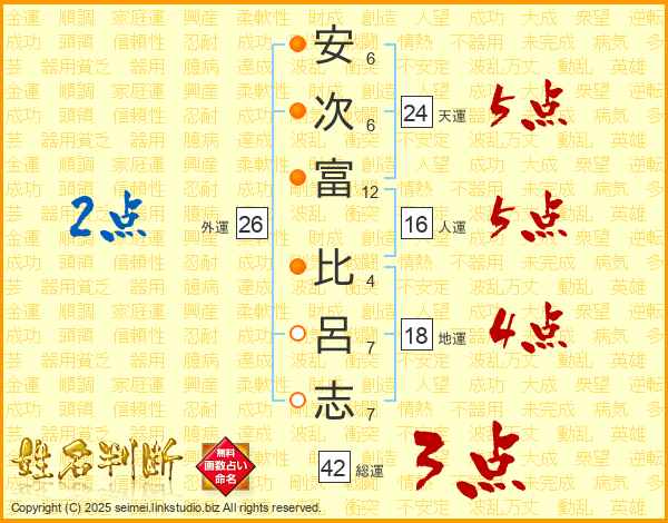 安(6画)次(6画)富(12画) 比(4画)呂(7画)志(7画)