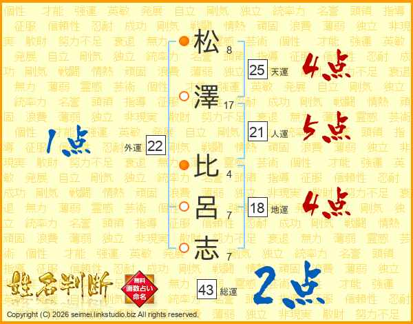 松(8画)澤(17画) 比(4画)呂(7画)志(7画)