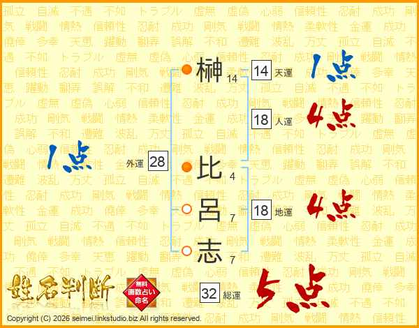 榊(14画) 比(4画)呂(7画)志(7画)