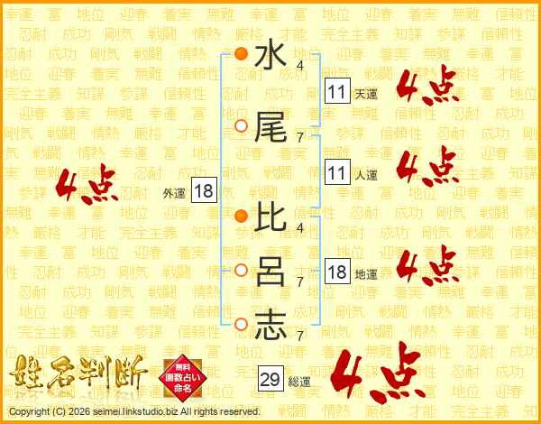 水(4画)尾(7画) 比(4画)呂(7画)志(7画)
