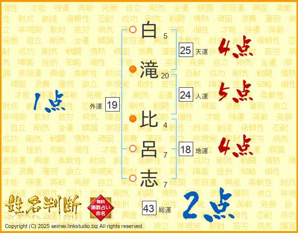 白(5画)滝(20画) 比(4画)呂(7画)志(7画)