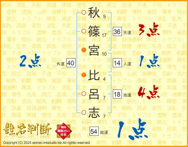 秋(9画)篠(17画)宮(10画) 比(4画)呂(7画)志(7画)