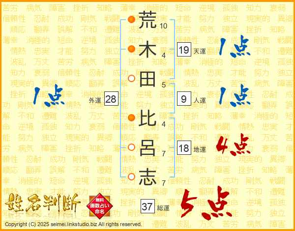 荒(10画)木(4画)田(5画) 比(4画)呂(7画)志(7画)