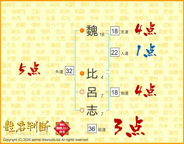 画数の奇数(○陽)と偶数(●陰)の配列で吉凶を占います。どちらかにかたよる名前は大凶名で避ける必要があります。画数の奇数偶数。