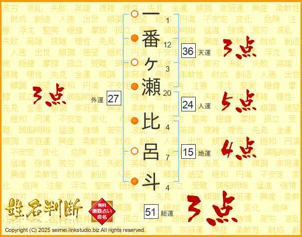 一番ヶ瀬比呂斗さんの総運は51画の3点!