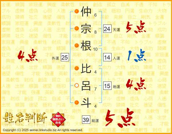 仲(6画)宗(8画)根(10画) 比(4画)呂(7画)斗(4画)