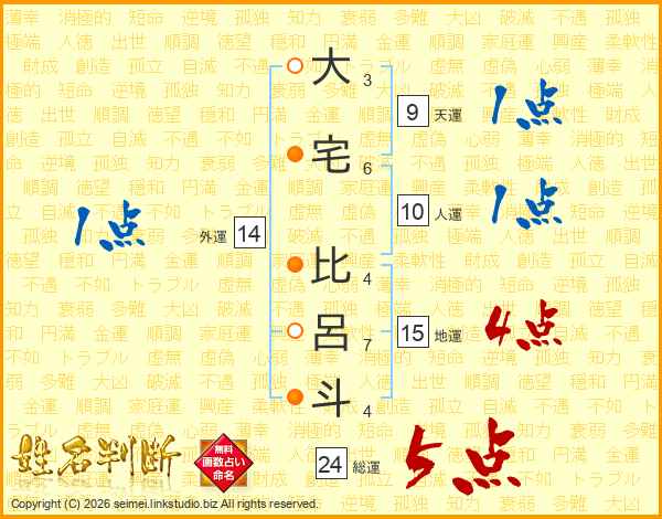 大宅比呂斗さんの総運は24画の5点!